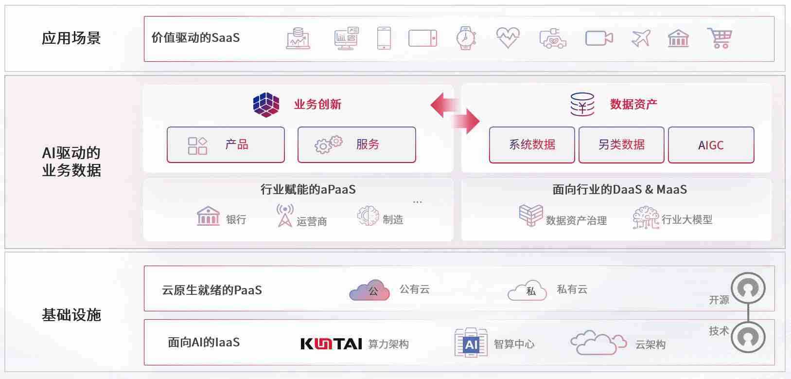 数字时代,,围绕企业数字化转型的关键要素,,,PA视讯游戏数码开创性的提出数云融合战略和技术体系框架,,,,着力在云原生、、、、数字原生、、、、AI原生和信创产业上架构产品和服务能力,,为处在不同数字化转型阶段的快消零售、、、、汽车、、金融、、、、医疗、、、、政企、、教育、、、、运营商等行业客户提供泛在的敏捷IT能力和融合的数据驱动能力,,构建跨界融合创新的数字业务场景和新业务模式,,,,助力企业级客户建立面向未来的核心能力和竞争优势,,全面推动社会的数字化、、、、智能化转型升级。。