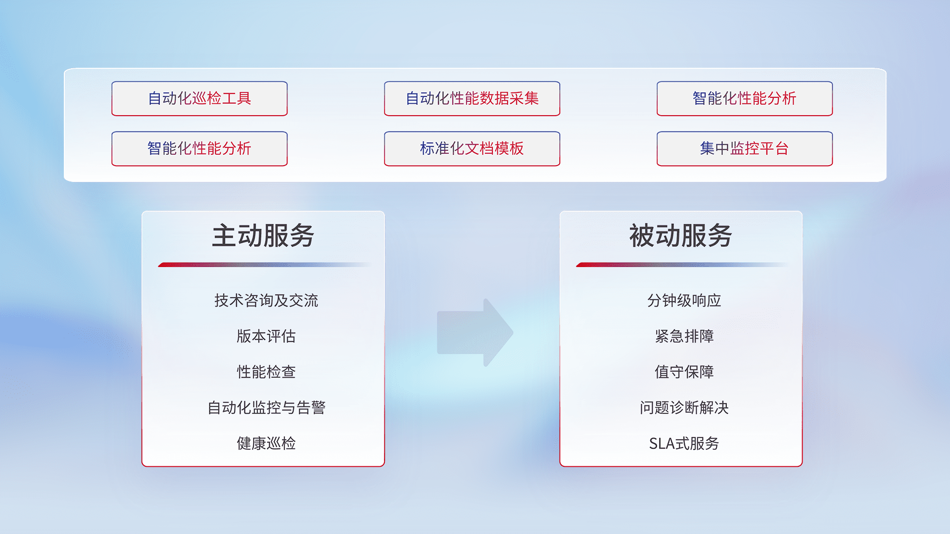 智能化工具和标准化文档,,保障服务质量,,,提供主动服务(包含技术咨询、、、、版本评估、、、性能检查、、自动化监控与告警、、、、健康巡检)和被动服务包含(分钟级响应、、、、紧急排障、、、值守保障、、、问题诊断解决、、SLA服务)。。。